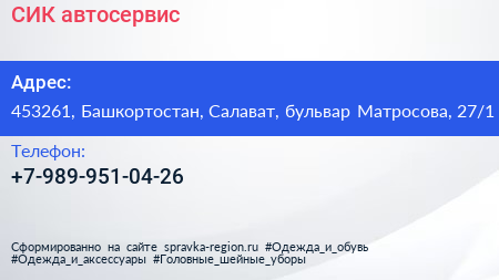 СИК, автосервис по адресу 453261, Башкортостан, Салават, бульвар Матросова, 27/1 в дальнейшем Организация, размещена в следующих категориях:
