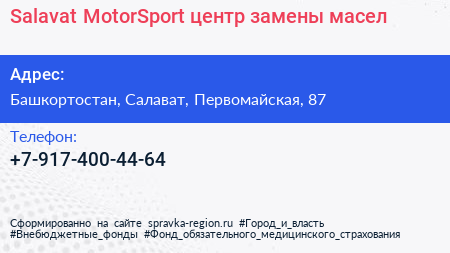 Salavat MotorSport, центр замены масел по адресу Башкортостан, Салават, Первомайская, 87 в дальнейшем Организация, размещена в следующих категориях: