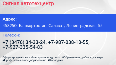 Сигнал, автотехцентр по адресу 453250, Башкортостан, Салават, Ленинградская, 55 в дальнейшем Организация, размещена в следующих категориях: