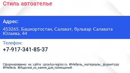 Стиль, автоателье по адресу 453265, Башкортостан, Салават, бульвар Салавата Юлаева, 44 в дальнейшем Организация, размещена в следующих категориях: