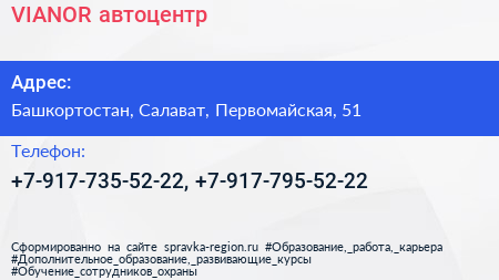 VIANOR, автоцентр по адресу Башкортостан, Салават, Первомайская, 51 в дальнейшем Организация, размещена в следующих категориях: