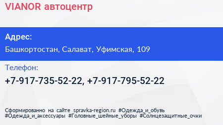 VIANOR, автоцентр по адресу Башкортостан, Салават, Уфимская, 109 в дальнейшем Организация, размещена в следующих категориях: