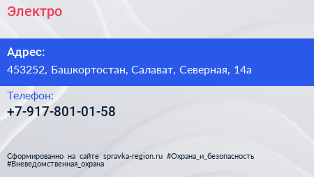 Электро+ по адресу 453252, Башкортостан, Салават, Северная, 14а в дальнейшем Организация, размещена в следующих категориях: