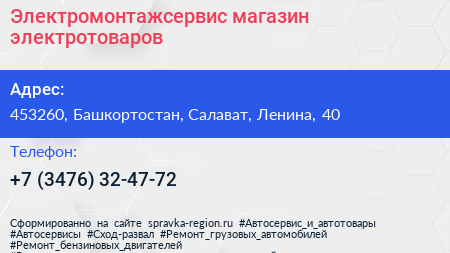 Электромонтажсервис, магазин электротоваров по адресу 453260, Башкортостан, Салават, Ленина, 40 в дальнейшем Организация, размещена в следующих категориях: