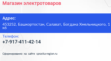 Магазин электротоваров по адресу 453252, Башкортостан, Салават, Богдана Хмельницкого, 1 к6 в дальнейшем Организация, размещена в следующих категориях: