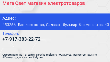 Мега-Свет, магазин электротоваров по адресу 453266, Башкортостан, Салават, бульвар Космонавтов, 43 в дальнейшем Организация, размещена в следующих категориях: