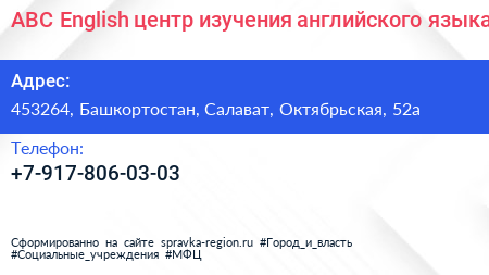 ABC English, центр изучения английского языка по адресу 453264, Башкортостан, Салават, Октябрьская, 52а в дальнейшем Организация, размещена в следующих категориях: