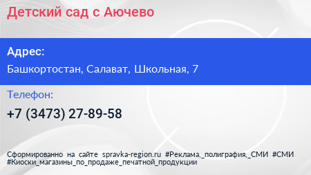 Детский сад, с. Аючево по адресу Башкортостан, Салават, Школьная, 7 в дальнейшем Организация, размещена в следующих категориях: