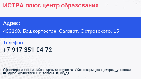 ИСТРА плюс, центр образования по адресу 453260, Башкортостан, Салават, Островского, 15 в дальнейшем Организация, размещена в следующих категориях: