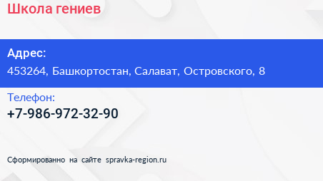 Школа гениев по адресу 453264, Башкортостан, Салават, Островского, 8 в дальнейшем Организация, размещена в следующих категориях: