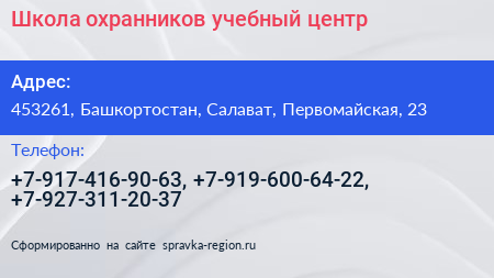 Школа охранников, учебный центр по адресу 453261, Башкортостан, Салават, Первомайская, 23 в дальнейшем Организация, размещена в следующих категориях: