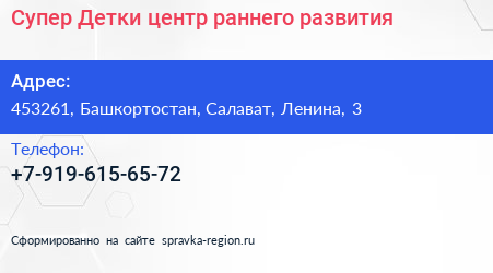 Супер-Детки, центр раннего развития по адресу 453261, Башкортостан, Салават, Ленина, 3 в дальнейшем Организация, размещена в следующих категориях: