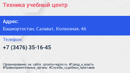 Техника, учебный центр по адресу Башкортостан, Салават, Колхозная, 46 в дальнейшем Организация, размещена в следующих категориях: