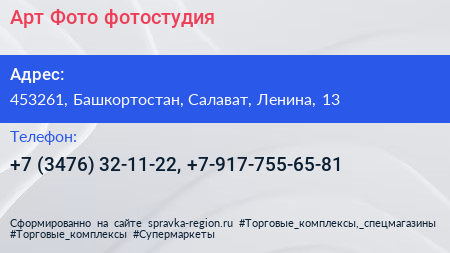 Арт-Фото, фотостудия по адресу 453261, Башкортостан, Салават, Ленина, 13 в дальнейшем Организация, размещена в следующих категориях: