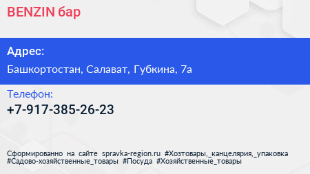 BENZIN, бар по адресу Башкортостан, Салават, Губкина, 7а в дальнейшем Организация, размещена в следующих категориях: