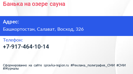 Банька на озере, сауна по адресу Башкортостан, Салават, Восход, 326 в дальнейшем Организация, размещена в следующих категориях: