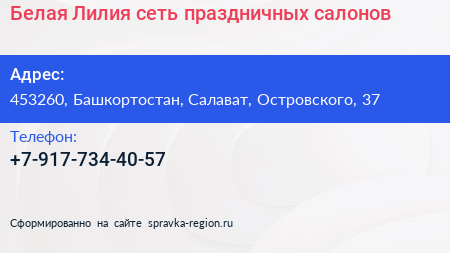 Белая Лилия, сеть праздничных салонов по адресу 453260, Башкортостан, Салават, Островского, 37 в дальнейшем Организация, размещена в следующих категориях: