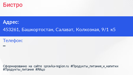Бистро по адресу 453261, Башкортостан, Салават, Колхозная, 9/1 к5 в дальнейшем Организация, размещена в следующих категориях: