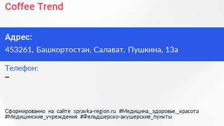 Coffee Trend по адресу 453261, Башкортостан, Салават, Пушкина, 13а в дальнейшем Организация, размещена в следующих категориях:
