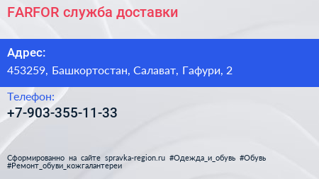 FARFOR, служба доставки по адресу 453259, Башкортостан, Салават, Гафури, 2 в дальнейшем Организация, размещена в следующих категориях: