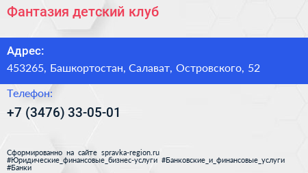 Фантазия, детский клуб по адресу 453265, Башкортостан, Салават, Островского, 52 в дальнейшем Организация, размещена в следующих категориях: