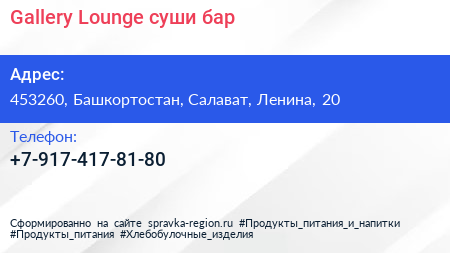 Gallery Lounge, суши-бар по адресу 453260, Башкортостан, Салават, Ленина, 20 в дальнейшем Организация, размещена в следующих категориях: