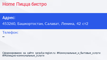 Home Пицца, бистро по адресу 453260, Башкортостан, Салават, Ленина, 42 ст2 в дальнейшем Организация, размещена в следующих категориях: