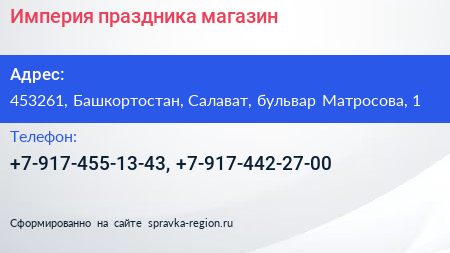 Империя праздника, магазин по адресу 453261, Башкортостан, Салават, бульвар Матросова, 1 в дальнейшем Организация, размещена в следующих категориях: