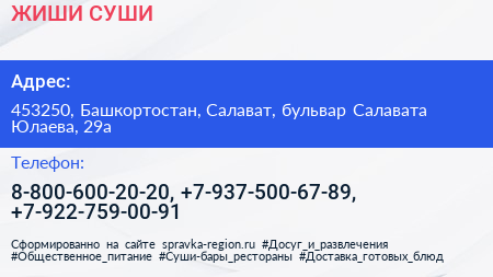 ЖИШИ СУШИ по адресу 453250, Башкортостан, Салават, бульвар Салавата Юлаева, 29а в дальнейшем Организация, размещена в следующих категориях: