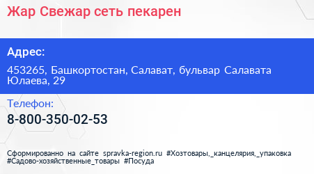 Жар Свежар, сеть пекарен по адресу 453265, Башкортостан, Салават, бульвар Салавата Юлаева, 29 в дальнейшем Организация, размещена в следующих категориях: