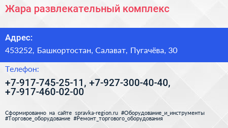Жара, развлекательный комплекс по адресу 453252, Башкортостан, Салават, Пугачёва, 30 в дальнейшем Организация, размещена в следующих категориях: