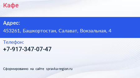 Кафе по адресу 453261, Башкортостан, Салават, Вокзальная, 4 в дальнейшем Организация, размещена в следующих категориях: