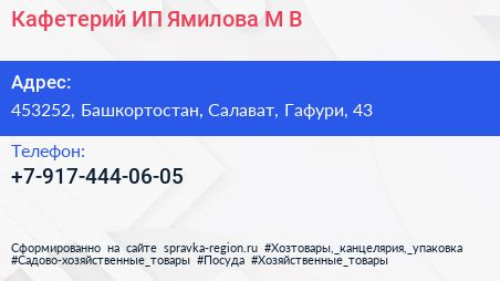 Кафетерий, ИП Ямилова М.В. по адресу 453252, Башкортостан, Салават, Гафури, 43 в дальнейшем Организация, размещена в следующих категориях: