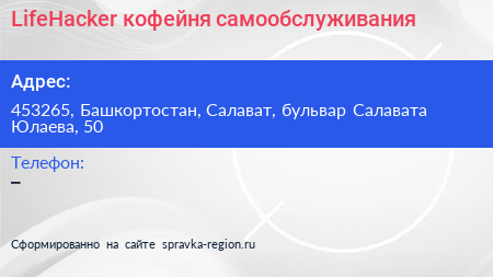 LifeHacker, кофейня самообслуживания по адресу 453265, Башкортостан, Салават, бульвар Салавата Юлаева, 50 в дальнейшем Организация, размещена в следующих категориях: