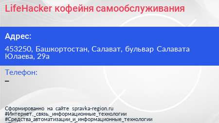 LifeHacker, кофейня самообслуживания по адресу 453250, Башкортостан, Салават, бульвар Салавата Юлаева, 29а в дальнейшем Организация, размещена в следующих категориях:
