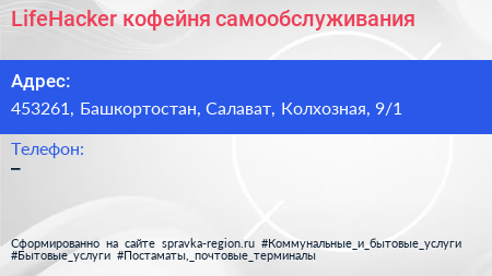 LifeHacker, кофейня самообслуживания по адресу 453261, Башкортостан, Салават, Колхозная, 9/1 в дальнейшем Организация, размещена в следующих категориях: