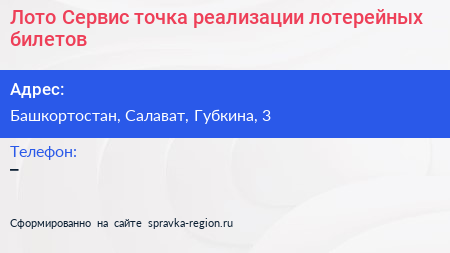 Лото Сервис, точка реализации лотерейных билетов по адресу Башкортостан, Салават, Губкина, 3 в дальнейшем Организация, размещена в следующих категориях: