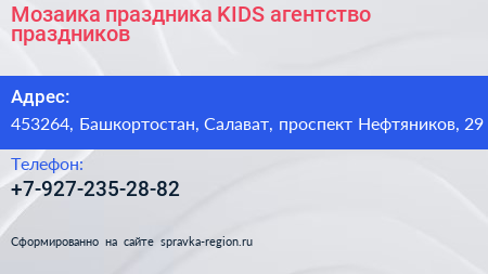 Мозаика праздника KIDS, агентство праздников по адресу 453264, Башкортостан, Салават, проспект Нефтяников, 29 в дальнейшем Организация, размещена в следующих категориях: