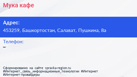Мука, кафе по адресу 453259, Башкортостан, Салават, Пушкина, 8а в дальнейшем Организация, размещена в следующих категориях: