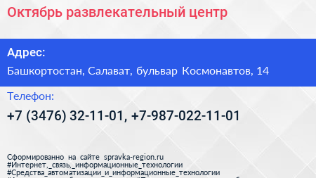 Октябрь, развлекательный центр по адресу Башкортостан, Салават, бульвар Космонавтов, 14 в дальнейшем Организация, размещена в следующих категориях: