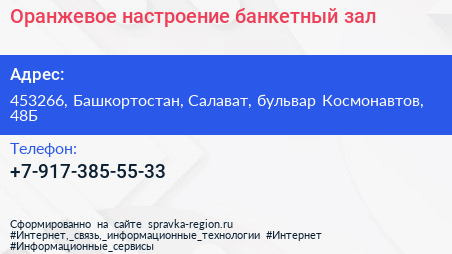 Оранжевое настроение, банкетный зал по адресу 453266, Башкортостан, Салават, бульвар Космонавтов, 48Б в дальнейшем Организация, размещена в следующих категориях:
