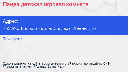 Панда, детская игровая комната по адресу 453260, Башкортостан, Салават, Ленина, 27 в дальнейшем Организация, размещена в следующих категориях: