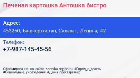 Печеная картошка Антошка, бистро по адресу 453260, Башкортостан, Салават, Ленина, 42 в дальнейшем Организация, размещена в следующих категориях: