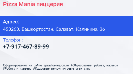 Pizza Mania, пиццерия по адресу 453263, Башкортостан, Салават, Калинина, 36 в дальнейшем Организация, размещена в следующих категориях:
