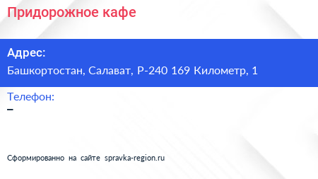 Придорожное, кафе по адресу Башкортостан, Салават, Р-240 169 Километр, 1 в дальнейшем Организация, размещена в следующих категориях:
