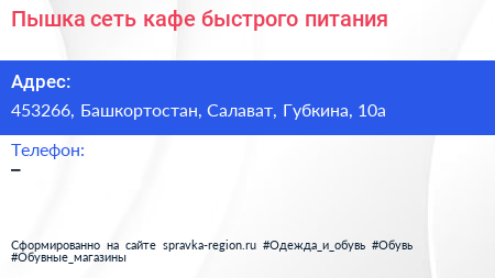 Пышка, сеть кафе быстрого питания по адресу 453266, Башкортостан, Салават, Губкина, 10а в дальнейшем Организация, размещена в следующих категориях: