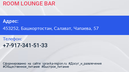 ROOM LOUNGE BAR по адресу 453252, Башкортостан, Салават, Чапаева, 57 в дальнейшем Организация, размещена в следующих категориях: