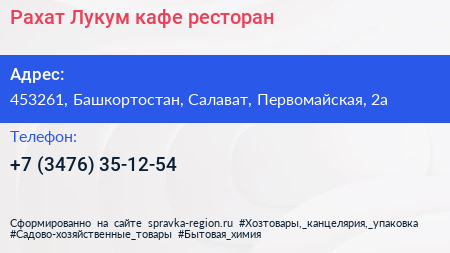 Рахат-Лукум, кафе-ресторан по адресу 453261, Башкортостан, Салават, Первомайская, 2а в дальнейшем Организация, размещена в следующих категориях: