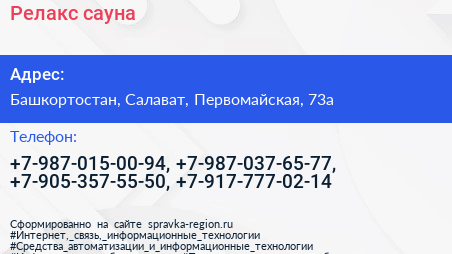 Релакс, сауна по адресу Башкортостан, Салават, Первомайская, 73а в дальнейшем Организация, размещена в следующих категориях: