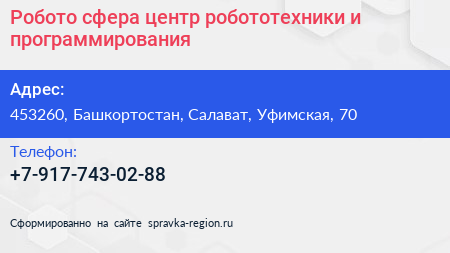 Робото сфера, центр робототехники и программирования по адресу 453260, Башкортостан, Салават, Уфимская, 70 в дальнейшем Организация, размещена в следующих категориях: